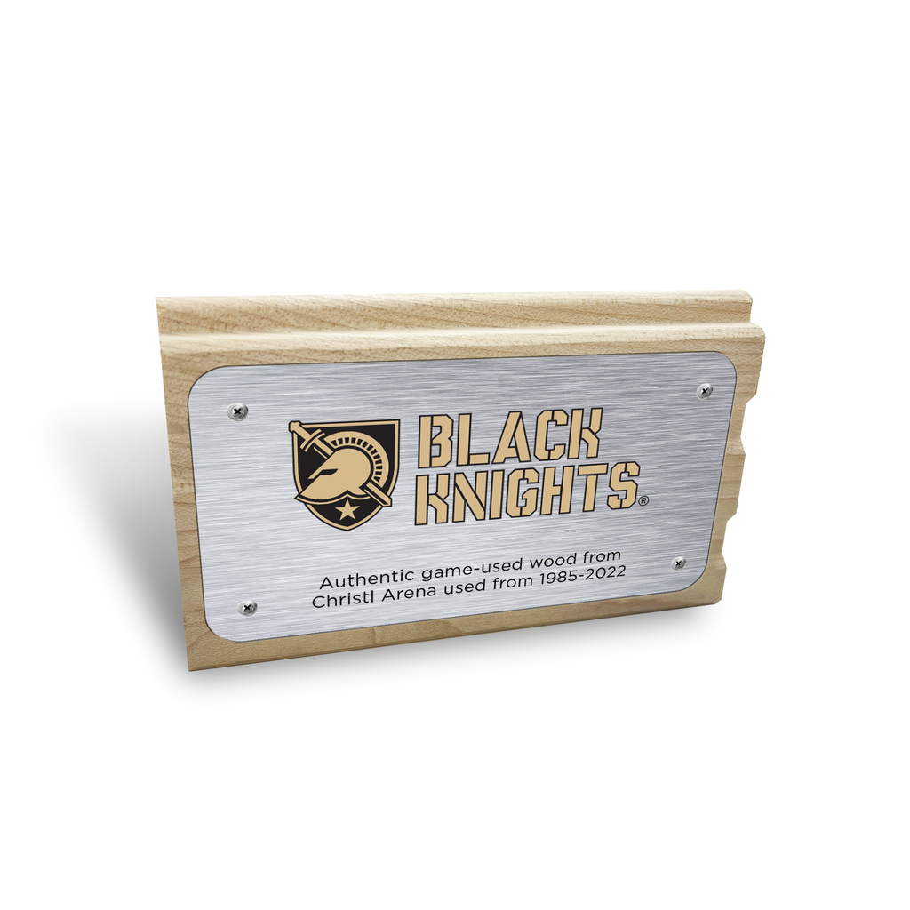 Our Army Black Knights Christl Arena Mini-Mini Court is a 2.25"x4" piece of game-used court from Christl Arena that the Black Knights played on from 1985-2022. Each mini-mini court is printed with a replica of the Christl Arena court on the front and a brushed metal plate with logos attached to the back. This handheld piece of memorabilia is essential for any collection.