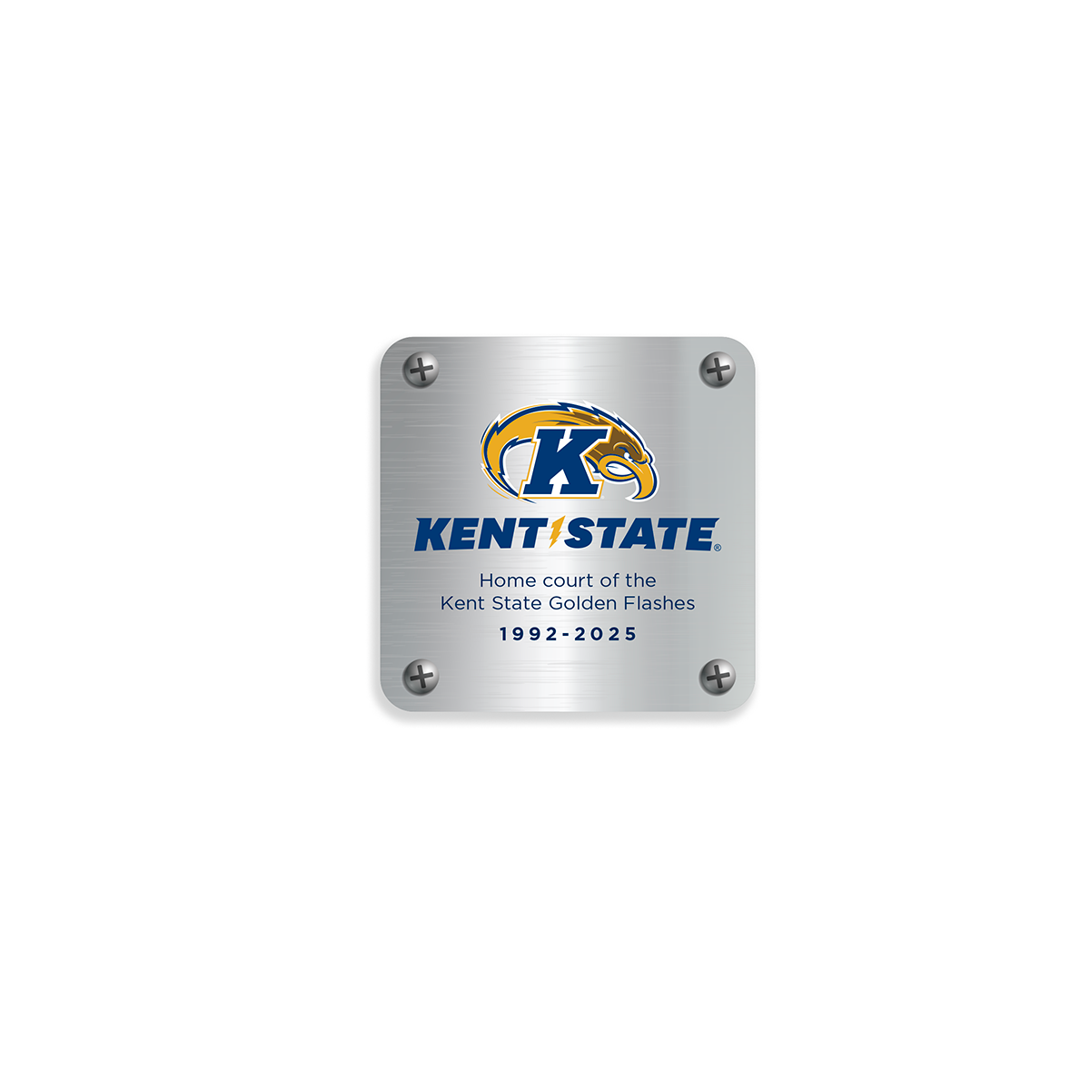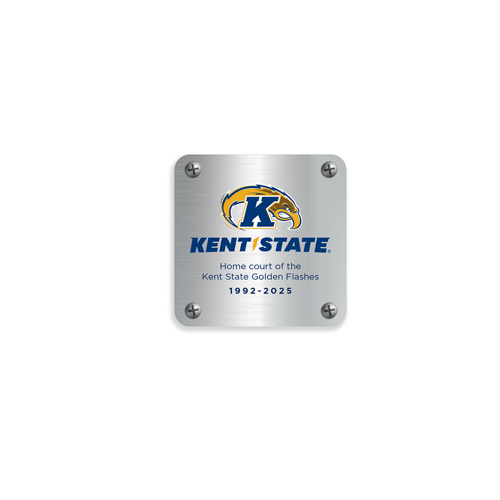 Our Kent State Golden Flashes Small Desk Frame makes a statement on any desk, shelf, or trophy case. Standing 9.5” tall by 7” wide, it features a 3”x3” block of game-used wood from the MAC Center court, appearing to float above the base in an acrylic frame that is printed with the Kent State logo. The wood block is printed with the MAC Center 75th Anniversary logo and is locked into place on the acrylic by a brushed metal plate on the back printed with logos and reads "Home court of the Kent State Golden Flashes 1992-2025".