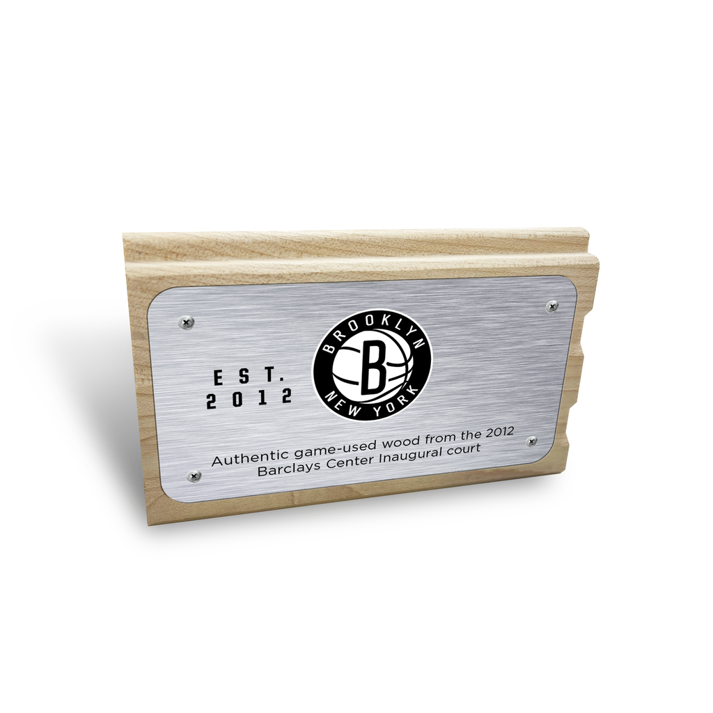 Our Brooklyn Nets Inaugural Season Mini-Mini Court is an authentic 2.25"x4" piece of game-used basketball court from the Barclays Arena. Printed with a replica of the 2012 Inaugural court graphic on the front and a brushed metal plate with logos attached to the back.. This handheld piece of memorabilia is essential for any collection.
