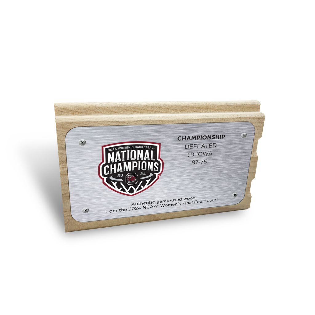 Celebrate the Gamecocks 2024 Women's NCAA® Championship win with this one-of-a-kind piece of history! Our South Carolina Gamecocks 2024 NCAA® Women's National Championship Mini-Mini Court is a 2.25"x4" piece of game-used court from the 2024 Women's Final Four® at Rocket Mortgage Fieldhouse in Cleveland, Ohio. Each mini-mini court is printed with a replica of the 2024 Women's Final Four® Court on the front and a brushed metal plate with the championship logo and game stats attached to the back. This handheld piece of memorabilia is essential for any collection.