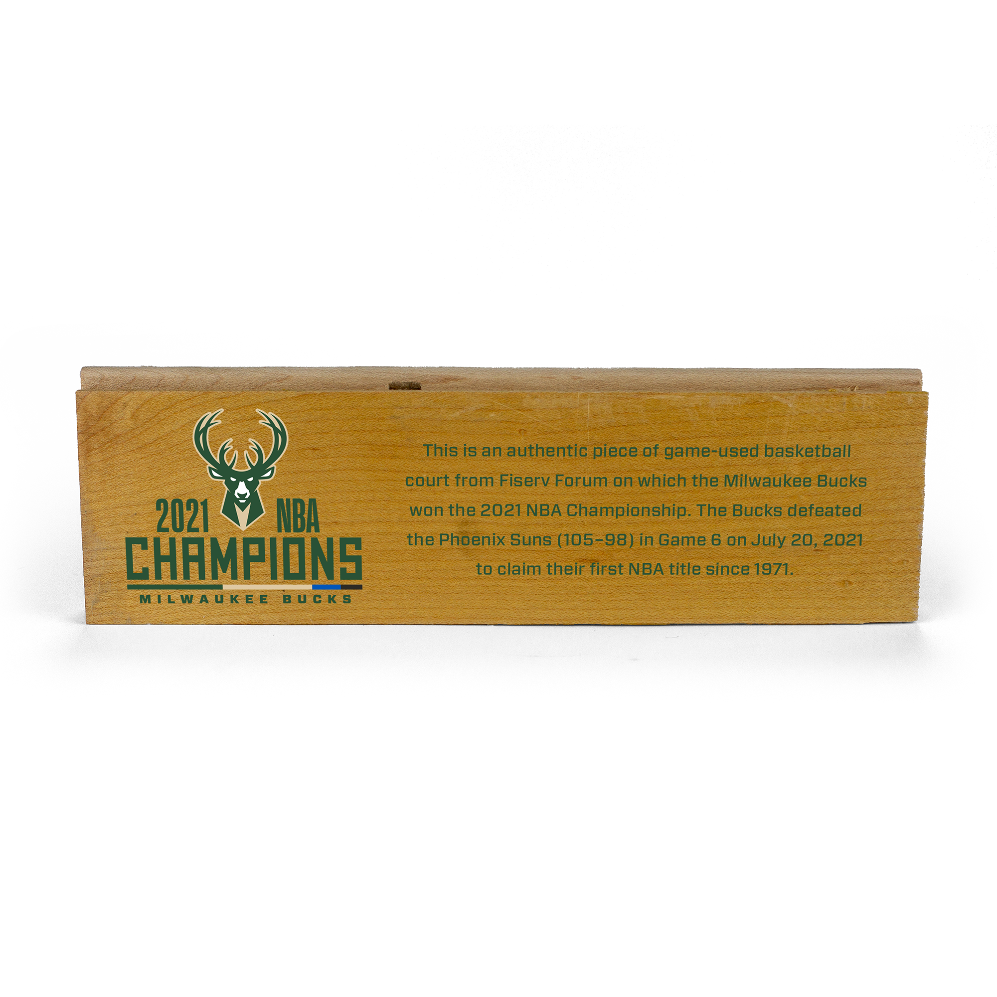The Milwaukee Bucks Championship Blonde Wood Block is perfect for fans who want their own piece of the NBA Championship court to hold, display, and pass around to friends to keep stories alive for years to come. This 2.25”x8” piece of game-used championship court features the 2021 Championship logo and the following description on each block: "This is an authentic piece of game-used basketball court from Fiserv Forum on which the Milwaukee Bucks won the 2021 NBA Championship. The Bucks defeated the Phoenix Suns (105–98) in Game 6 on July 20, 2021 to claim their first NBA title since 1971."