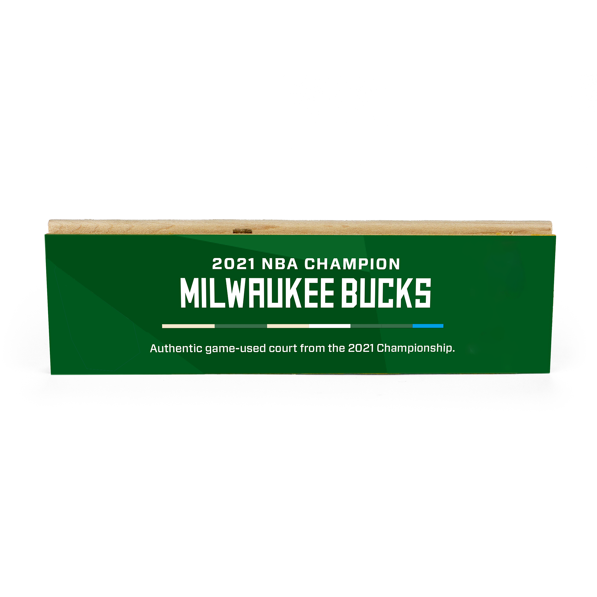 The Milwaukee Bucks Championship Green Wood Block is perfect for fans who want their own piece of the NBA Championship court to hold, display, and pass around to friends to keep stories alive for years to come. This 2.25”x8” piece of game-used championship court features the 2021 Championship logo and the following description on each block: "This is an authentic piece of game-used basketball court from Fiserv Forum on which the Milwaukee Bucks won the 2021 NBA Championship. The Bucks defeated the Phoenix Suns (105–98) in Game 6 on July 20, 2021 to claim their first NBA title since 1971."