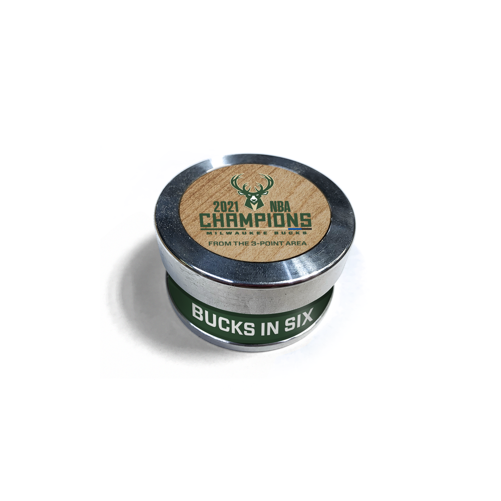 Our Milwaukee Bucks Championship 3-Point Desk Trophy is ideal for fans who want a subtle and stately trophy for daily use. It’s milled from a solid block of aluminum to a finished size of 2.5”w x 1.5”h and features a 1.75” diameter medallion of game-used court wood from the 3-Point area. Around the base of the medallion is a silicone band embossed with “BUCKS IN SIX.” The aluminum Desk Trophy weighs in at just under a half pound and creates a stately silver presence for any desk or trophy case and will not tarnish, rust, or lose its beautiful luster.