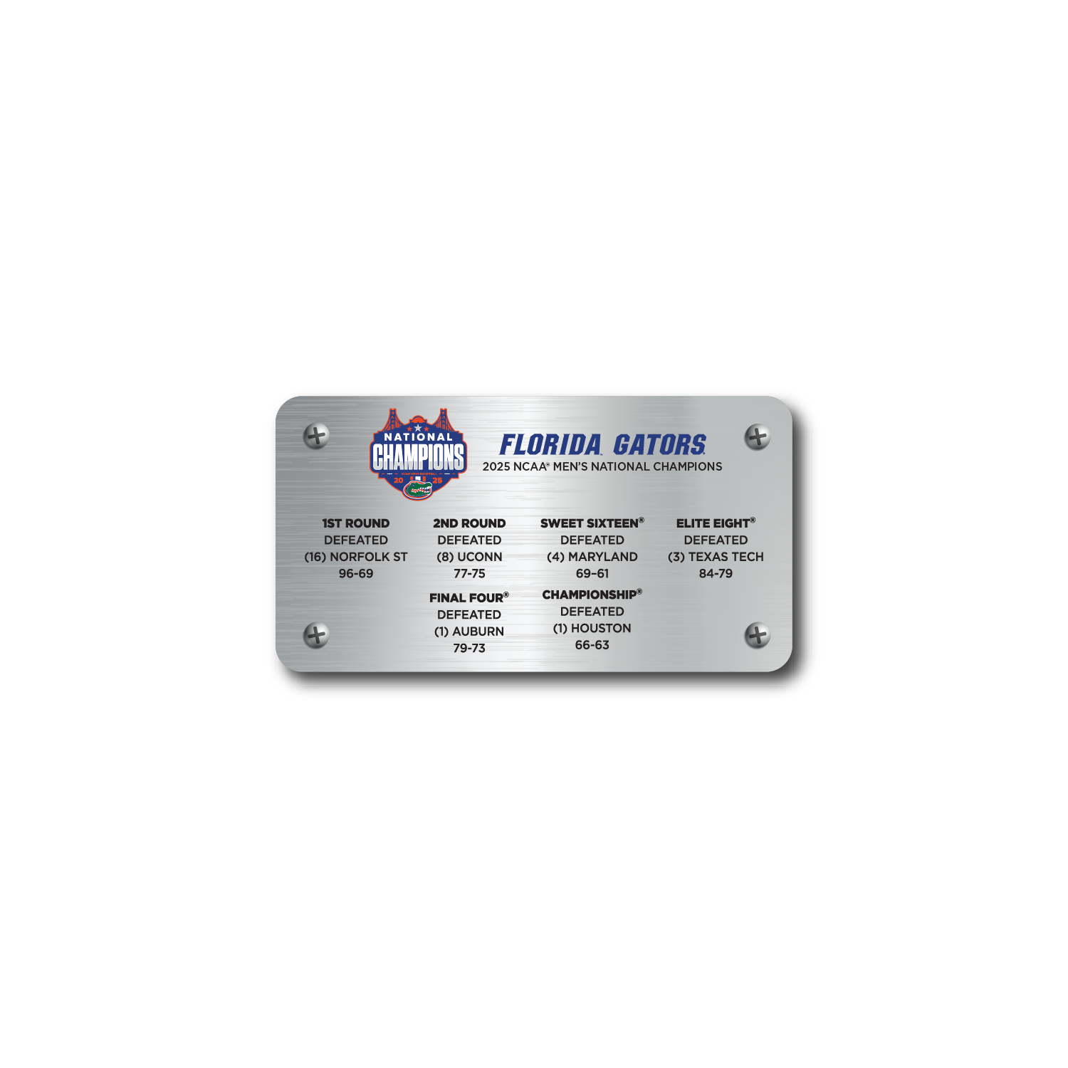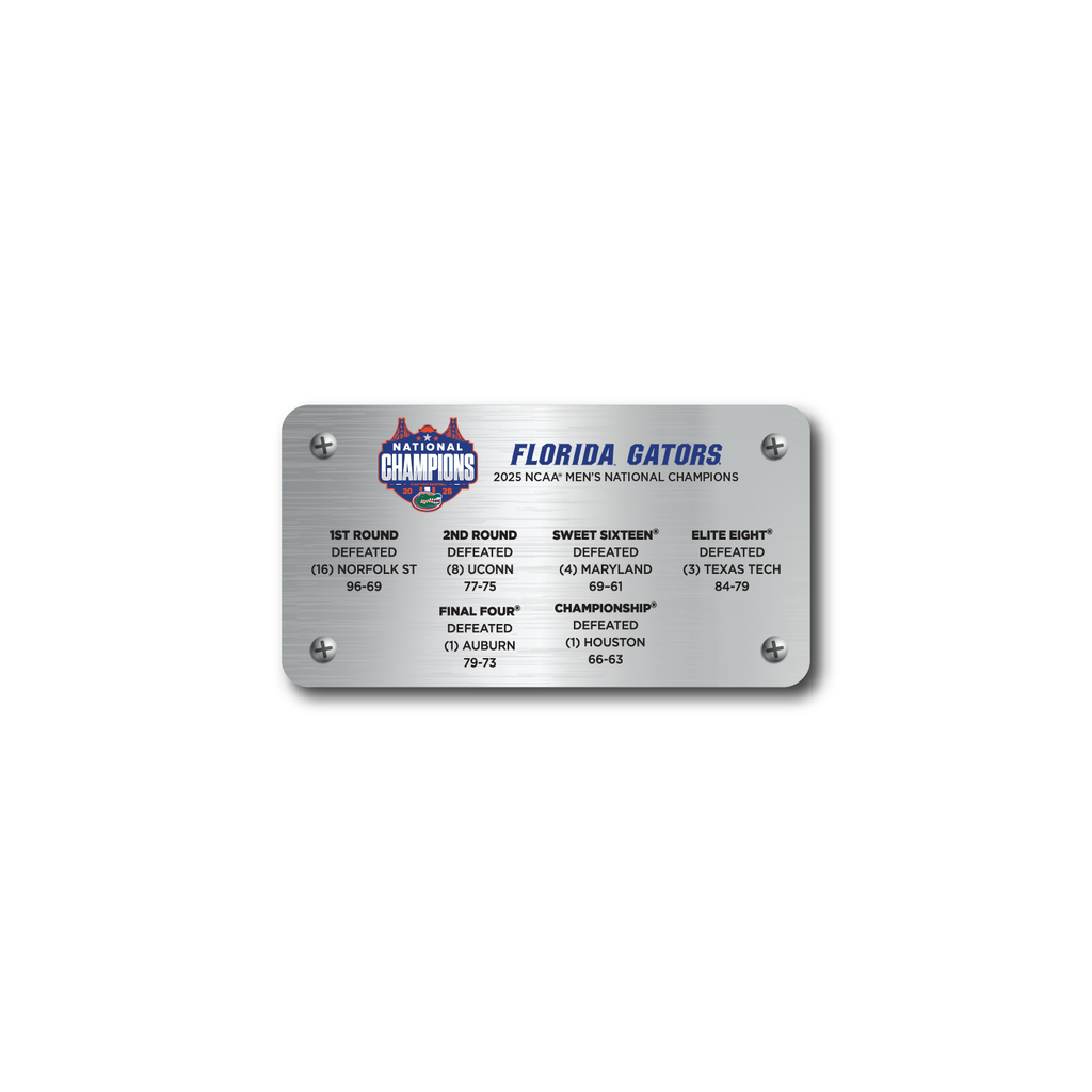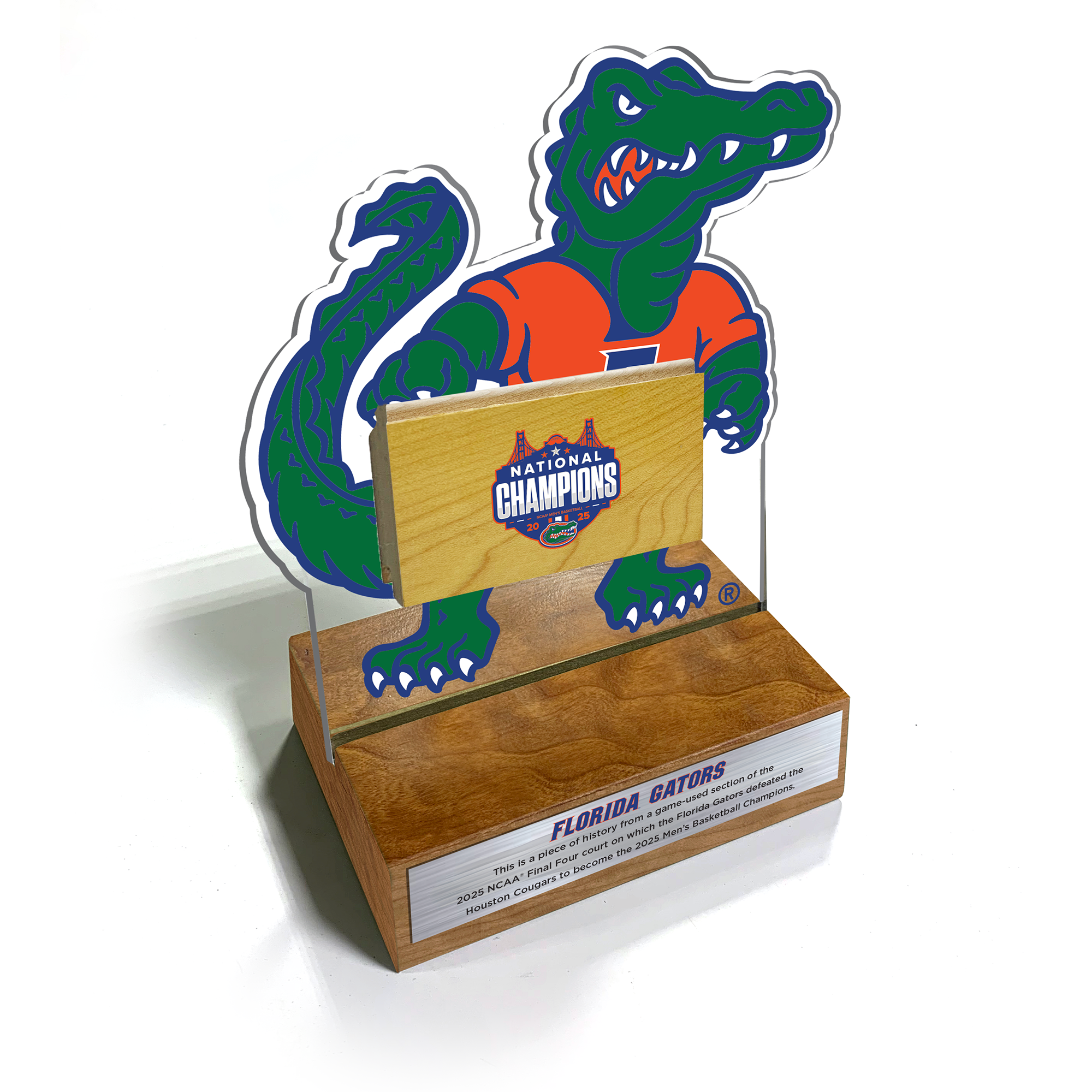 Our University of Florida Gators 2025 Men's NCAA® National Championship desk frame makes a statement on any desk, shelf, or trophy case. Standing 9.5” tall by 6” wide, it features a 2.25”x4” block of game-used wood from the 2025 Final Four® court, appearing to float above the base in an acrylic frame that is printed with the Gator logo. The wood block is printed with the championship logo and is locked into place on the acrylic by a brushed metal plate on the back printed with team stats from the championship tournament.