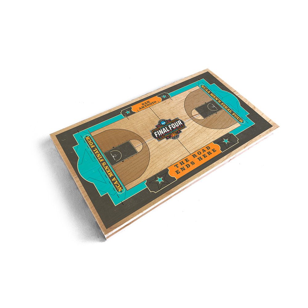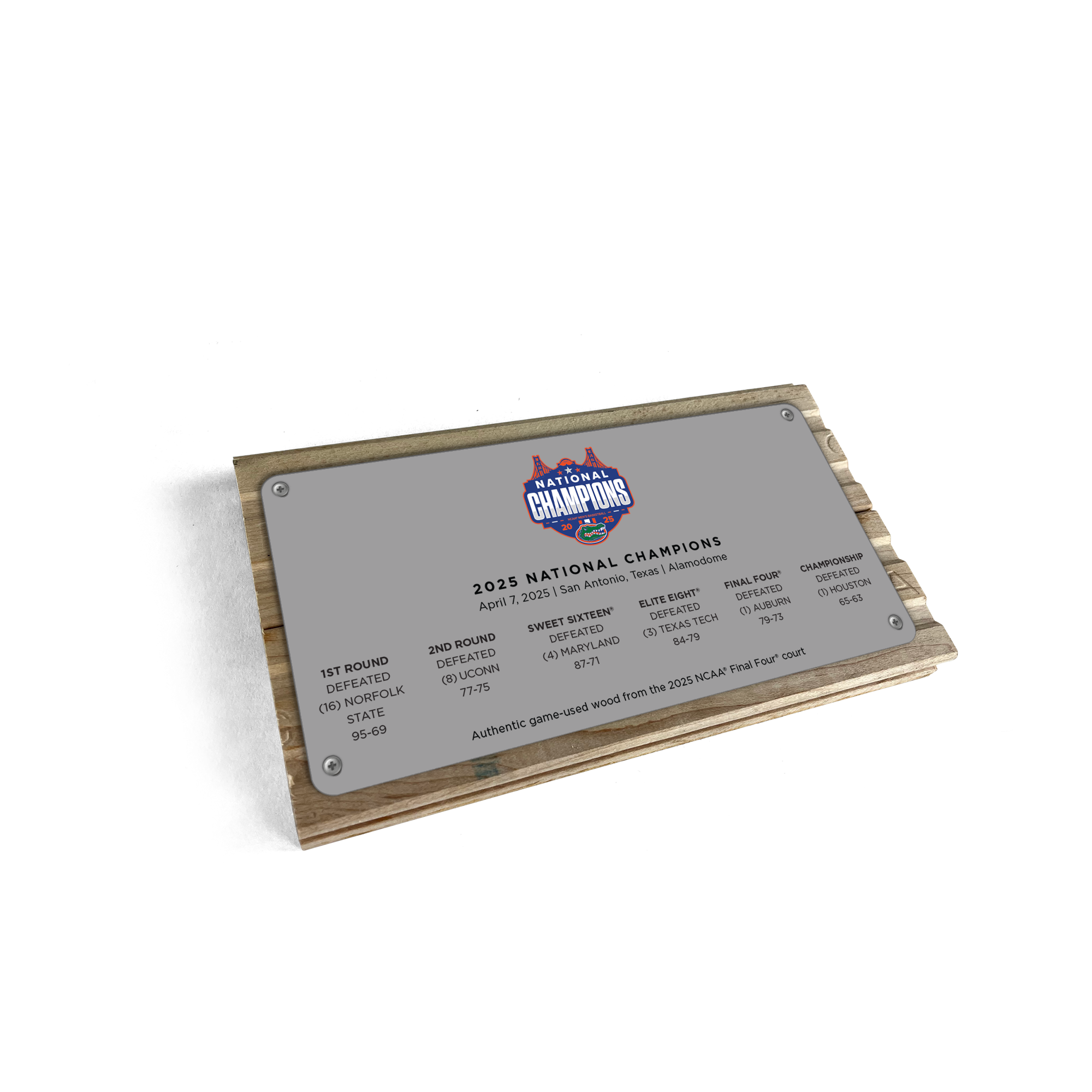 Our 2025 Men's NCAA® National Championship Mini Court is a way for fans to remember the Gators 2025 National Championship run for years to come. Each 8.5”x4.5” piece is printed with a replica of the 2025 Men’s NCAA® National Championship Court on the front and a brushed metal plate with the championship logo and game stats attached to the back. This is an authentic piece of game-used basketball court from the 2025 Men’s Final Four® held in San Antonio, TX, where the University of Florida Gators defeated the Houston Cougars on April 7, 2025. Own a piece of Gators history today!