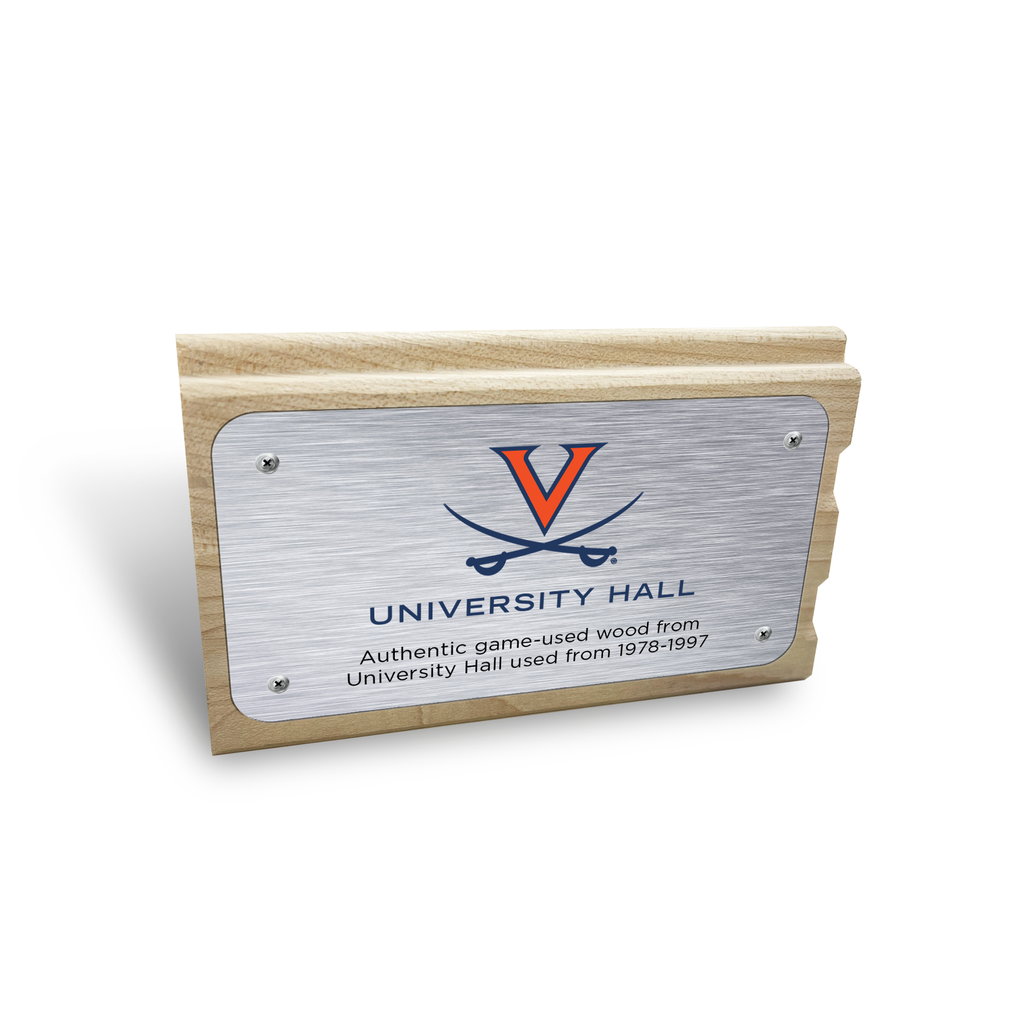 Celebrate the glory and triumph achieved at University Hall with this one-of-a-kind piece of history! Our Virginia Cavaliers University Hall Mini-Mini Court is a 2.25"x4" piece of game-used court from University Hall that the Cavaliers played on from 1978-1997. Each mini-mini court is printed with a replica of the University Hall court on the front and a brushed metal plate with logos attached to the back. This handheld piece of memorabilia is essential for any collection.