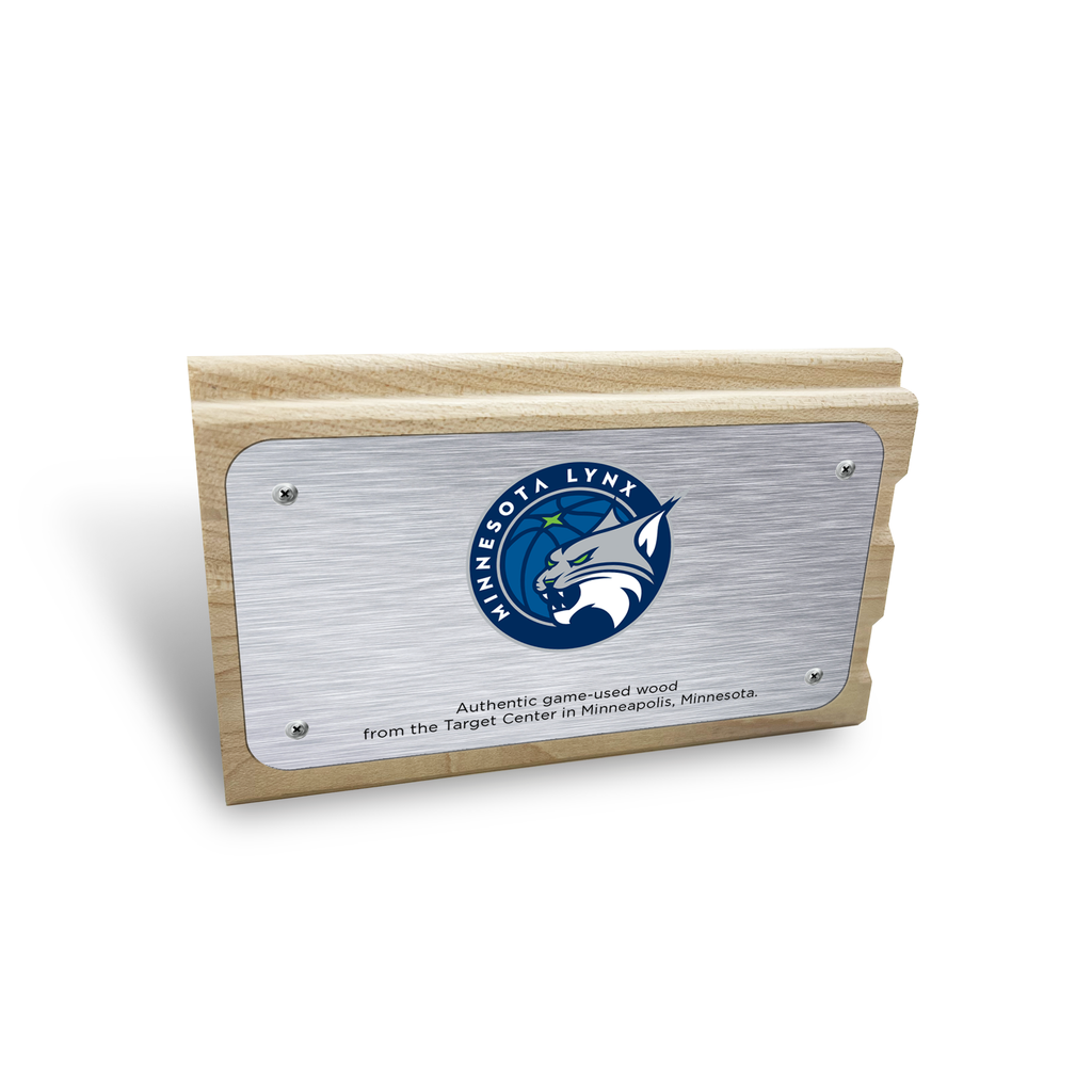 Our Minnesota Lynx Mini-Mini Court is an authentic 2.25"x4" piece of game-used basketball court from the Target Center. Printed with a replica of the Target Center court graphic on the front and a brushed metal plate with a logo attached to the back. This handheld piece of memorabilia is essential for any collection.