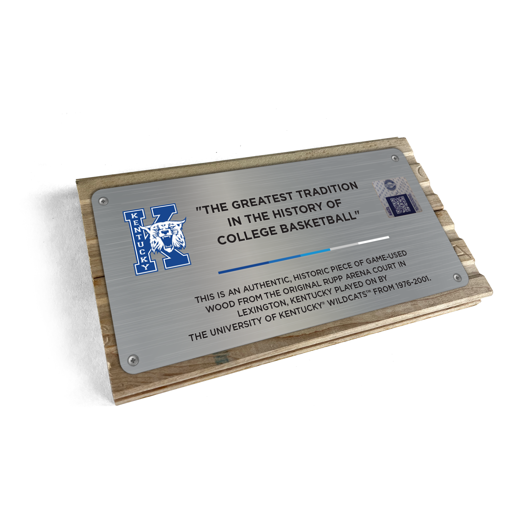 Each 8.5”x4.5” piece has an image of the original Rupp Arena court layout. The Mini Court has a brushed metal plate on the back printed with logos and a description that reads "This is an authentic section of game-used court from Rupp Arena in Lexington KY where the University of Kentucky® Wildcats played from 1976-2001"