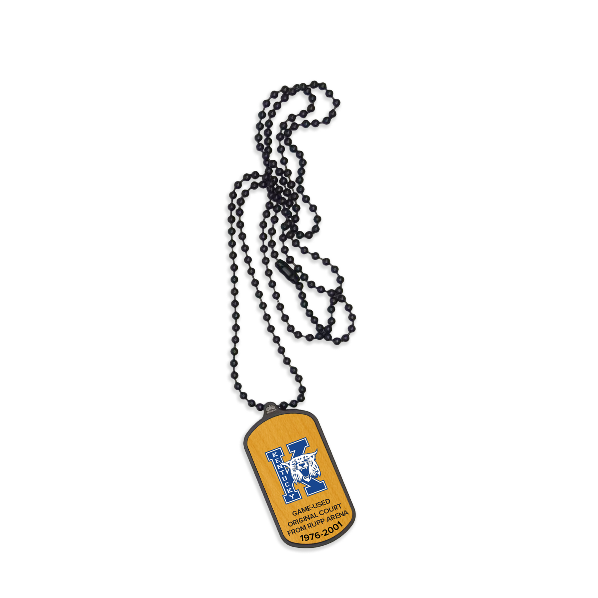Make a statement with our Original Rupp Arena Vintage Wildcat Small Dog Tag! Each 1 1/8"x2 1/8" dog tag is finished with a game-used piece of wood from the Rupp Arena court that the Wildcats played on from 1976-2001. Printed with a vintage Wildcat logo, this one-of-a-kind dog tag lets wear your fandom around your neck and take it with you wherever you may go. Own a piece of Rupp Arena history today!